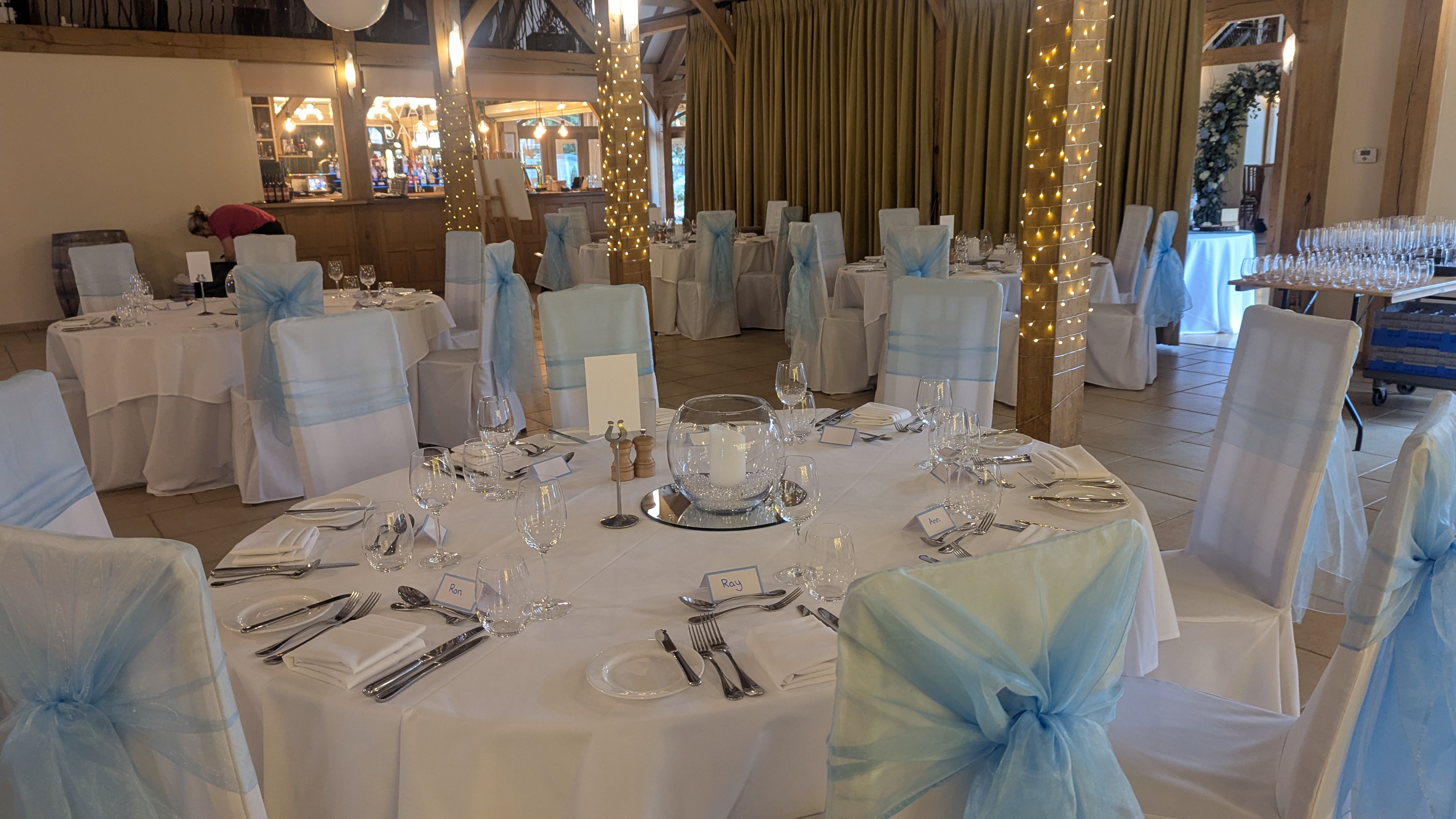 I caught the groom putting finishing touches to the wedding breakfast space, and so I coaxed him out and sent him off to get ready, and I finished decorating tables and took lots of photos to show the bride, as she wanted a sneak peek at it all. It looked phenomenal, and I have not seen the barn looking so beautiful. It was perfectly lit, had the right amount of decor, and was in their colour theme of baby blue.