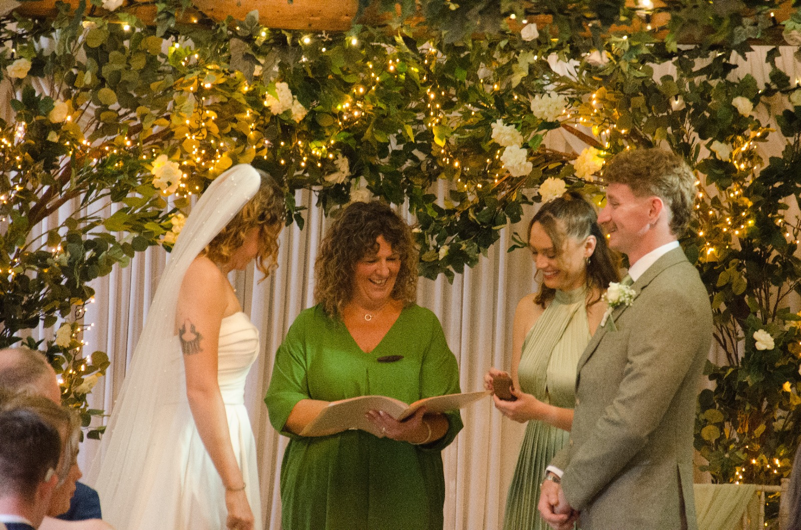 "Some weddings are beautiful, some are joyful – and then there are weddings like this one, bursting with love, laughter, and unforgettable personal touches in equal doses. I’d been looking forward to this wedding day, excited to see my couple in their finery, (the bride's dress had a fabulous split all the way up the front), and deliver what promised to be a fun ceremony!