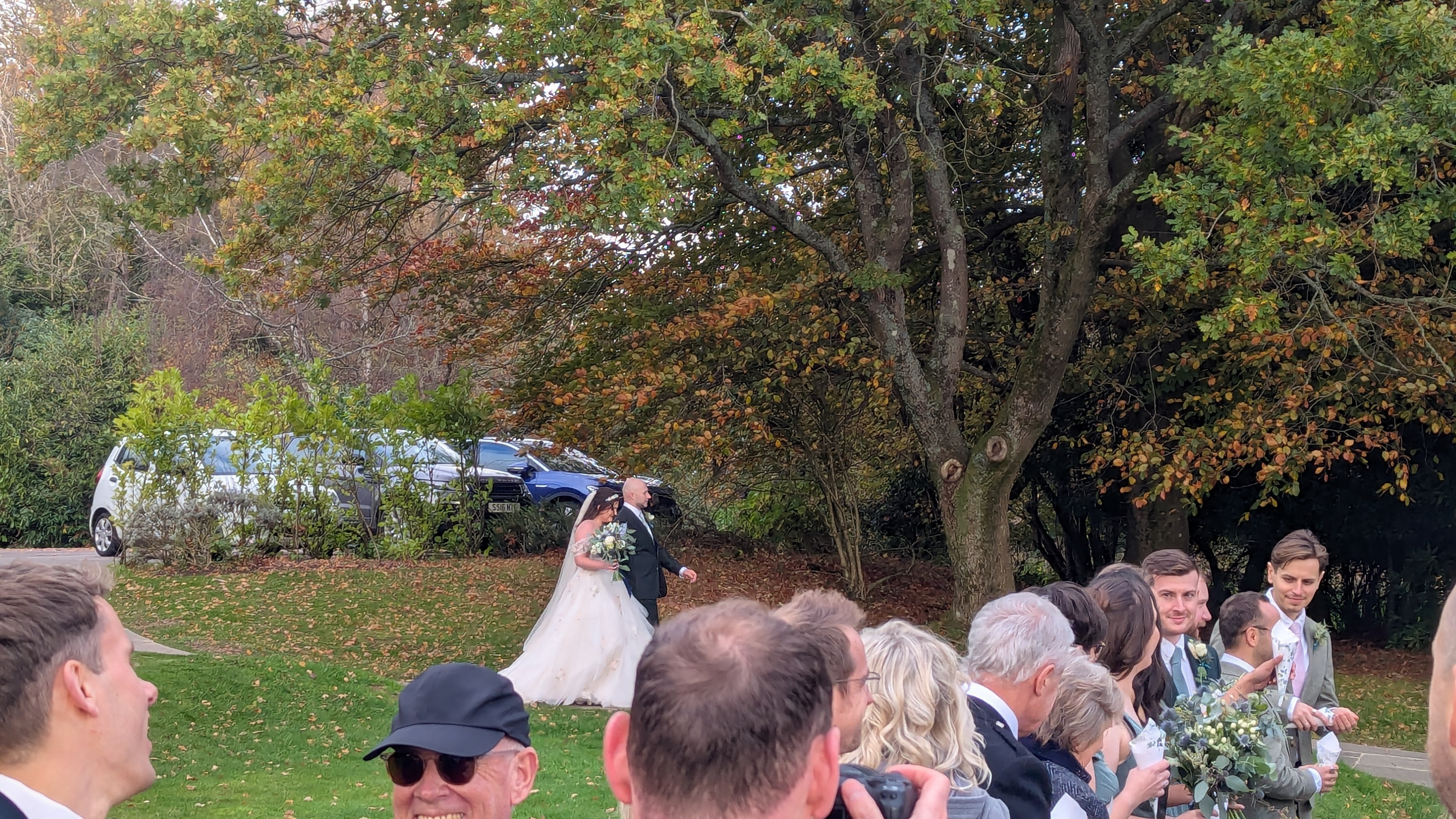 As I then headed outside to address everyone and settle the groom, the weather held, and we even had some breaks in the clouds, and bright light filled the space. With a warm welcome delivered, it was time to ask everyone to stand to receive the bride and her crew, and as the music began, the bridesmen led the procession and looked super smart in their suits.