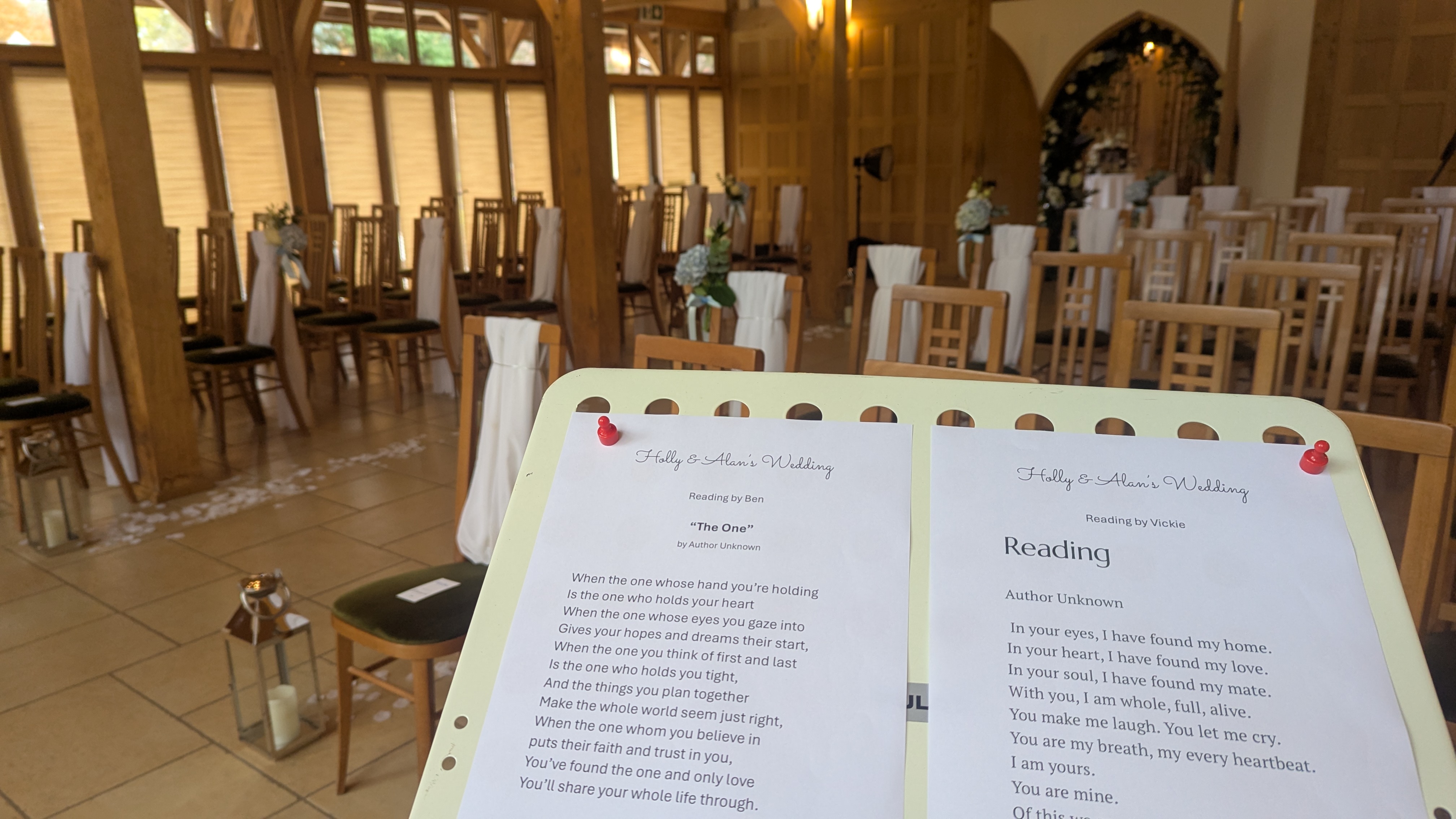 We had a lovely introduction, words on marriage, and what it all means to the couple, followed by the first reading. In the middle of the ceremony was a recap of their love story, which I had written as a personal and bespoke poem. It went down a storm, and we asked everyone to join in for a lovely moment towards the end. Cheers went up afterward for the couple, and we then had a second reading and completed this part of the celebrations with words on love and the future for Holly and Alan.
