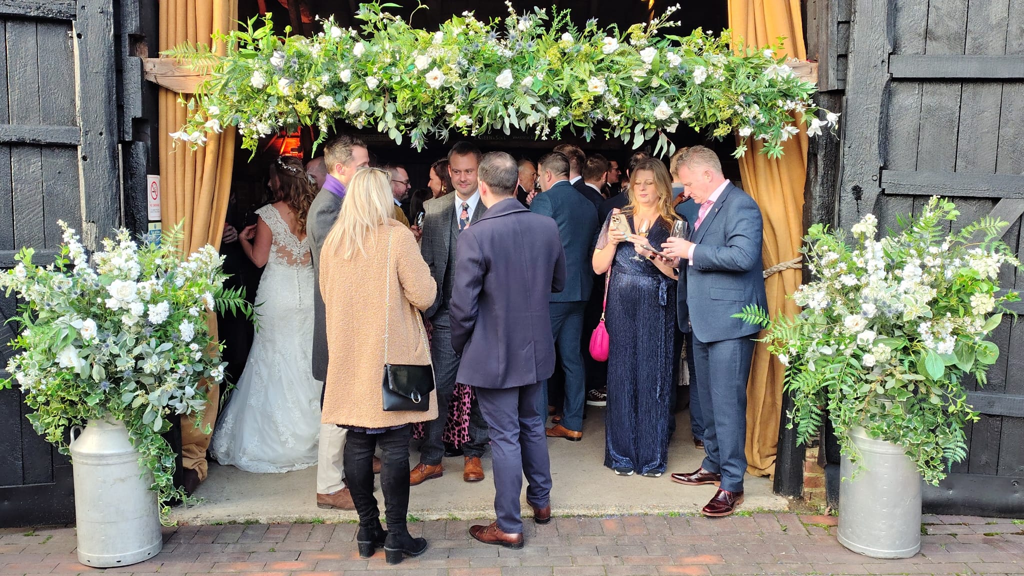 Rob arrived with Lucas and their closest family, ready to greet guests as they gathered in the historic barns for a pre-ceremony drink. Everyone was on a high after Christmas and buzzing with excitement to celebrate this union.