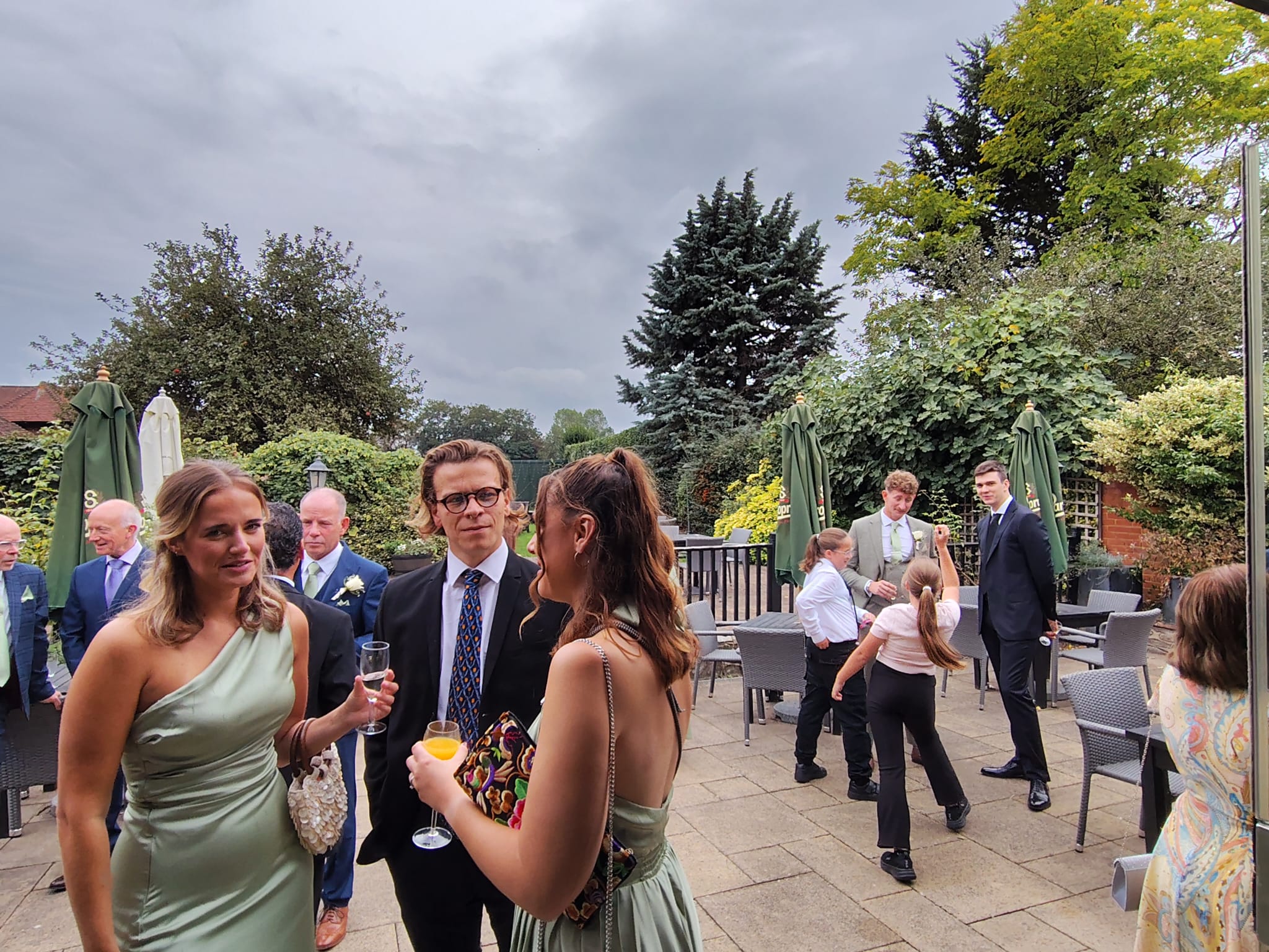 After the ceremony, the rain clouds parted, and we created a bubble arch for the newlyweds to walk through in the courtyard, and then they joined their guests in the gorgeous Garden Room for drinks and photos.